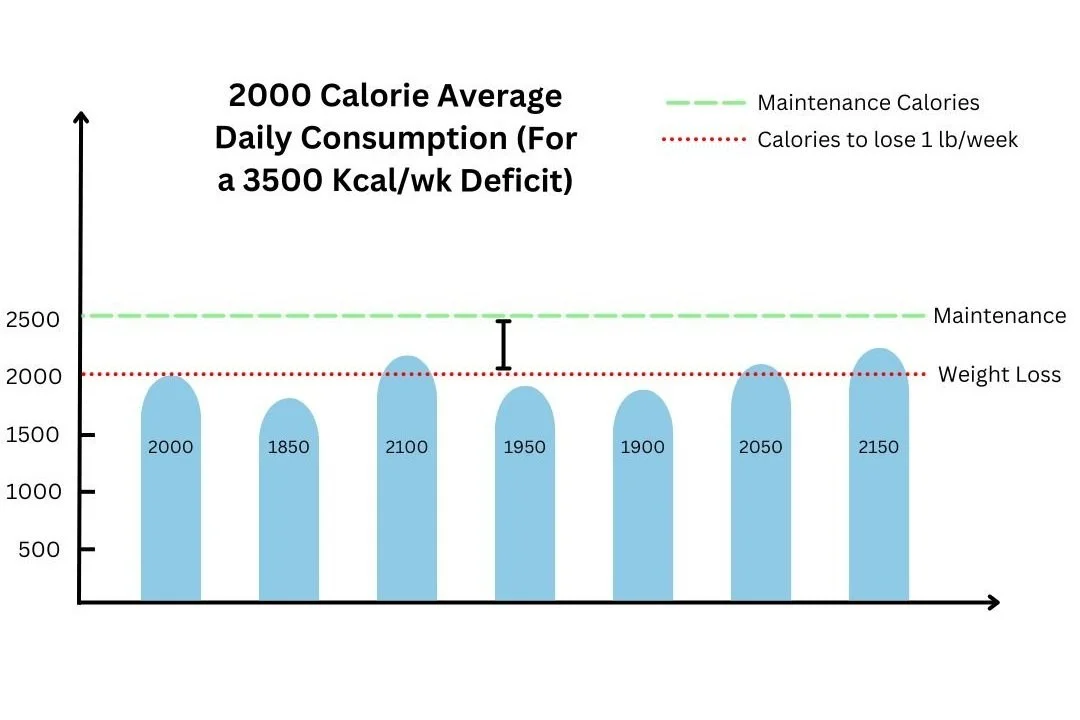 For example, if you need to consume 2000 calories per day to maintain your weight, you could aim for a 500-calorie deficit per day, resulting in a 3500-calorie deficit per week (which is roughly equivalent to one pound of fat loss). However, you don't have to eat exactly 1500 calories every day. Some days you might eat a bit more, some days a bit less, as long as your weekly average is below your maintenance calories.